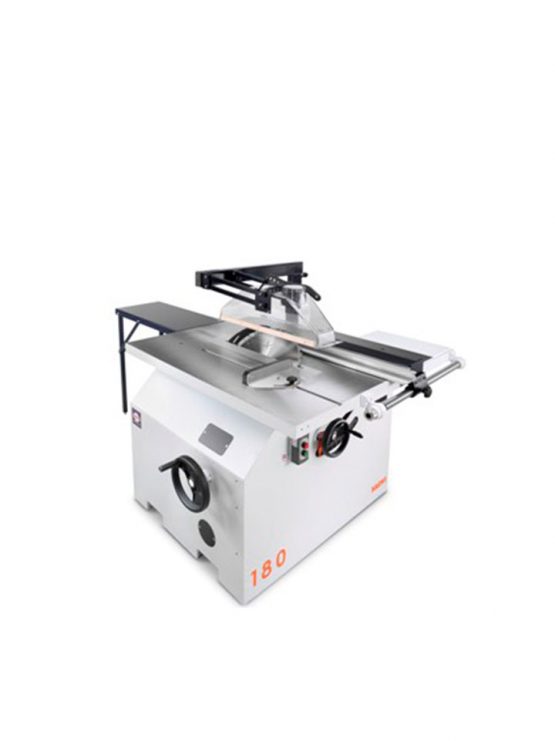 De 180 kan worden geleverd met een elektrische hoogte- en schuinverstelling en een afneembare afkortroltafel van 750mm of 1250mm vóór de zaag. Motor standaard 7,5kW en optioneel 11kW.