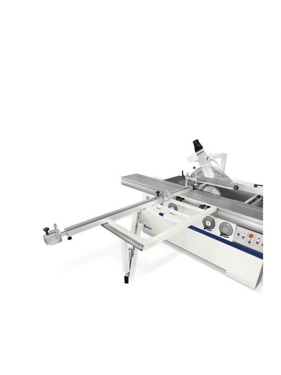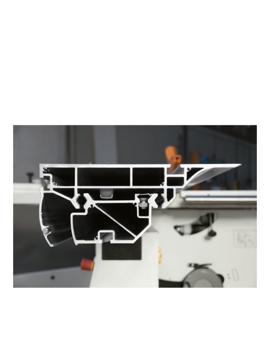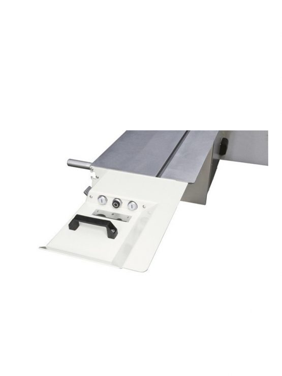 Oplegtafel (Afm. 1200 x 650 mm.)voorzien van telescoopaanslag met 2 opklapbare aanslagnokken, maatliniaal en vrijlooprol.