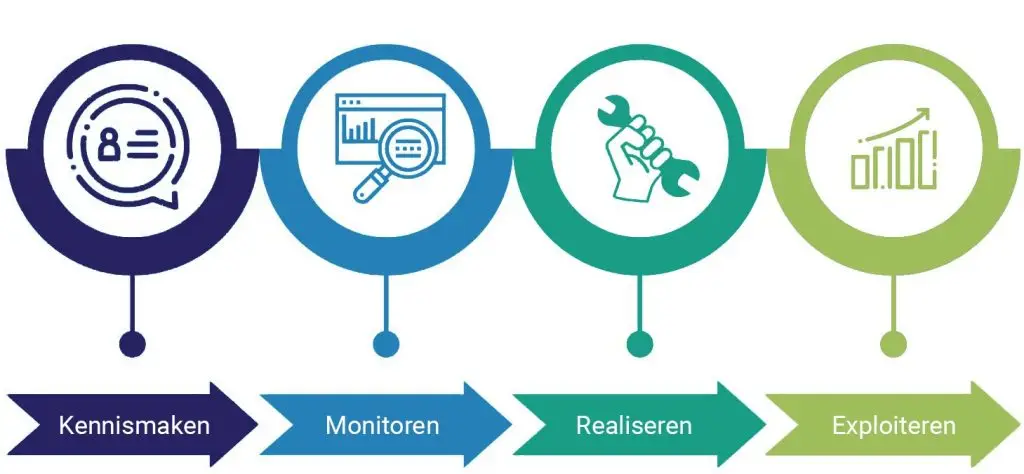 Onze adviseurs hanteren een vier-faseplan voor het verduurzamen van bedrijventerreinen en recreatieparken. Dit plan bestaand uit: kennismaking, monitoren, realiseren en exploitatiefase. Omdat elke verduurzamingsoplossing maatwerk vereist, onder meer op basis van gemeten data, maken we gebruik van twee ‘Go/No-Go’-momenten tussen de eerste-tweede en tweede-derde fase. Hiermee worden investeringskosten in een raam-offerte voor de volgende fase stapsgewijs uitgewerkt, en indien gewenst geaccordeerd.